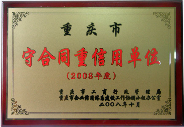 繼2007年公司取得九龍坡區“守合同重信用單位”后,各部門再接再厲,不斷狠抓內部管理。2008年 通過重慶市工商局專家組評審,認定我公司為“重慶市守合同重信用單位”。